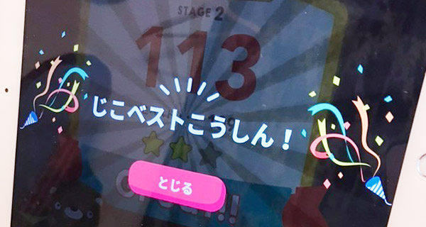 自己ベストの更新を楽しみにしています。前回の点数と比べて今回のほうができた!というのが嬉しいみたいで、自己ベストの更新をお祝いするポップアップがでるとすごく喜んでいます。でもその反面、更新できなかったときはしょぼんと…(笑)たくさんクリアしてレベルアップしたことで、最近は問題が難しくなってきて解けずに終わってしまうこともあり、親として声かけに迷うこともあります。